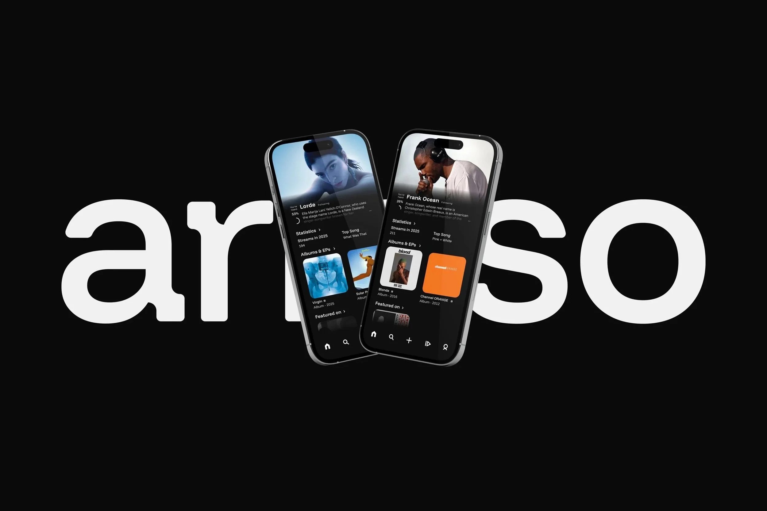 Arioso is a profile-based music platform combining streaming, social media, and reviews. Users follow friends, track listening habits, and share their thoughts on the music they listen to. The experience emphasizes connection, allowing users to engage with music through both personal and social lenses. The minimal black-and-white interface lets album artwork provide the primary color and visual focus.
